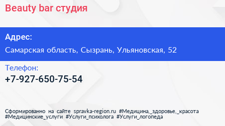 Beauty bar, студия по адресу Самарская область, Сызрань, Ульяновская, 52 в дальнейшем Организация, размещена в следующих категориях: