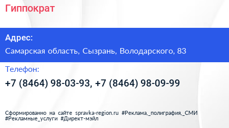 Гиппократ по адресу Самарская область, Сызрань, Володарского, 83 в дальнейшем Организация, размещена в следующих категориях: