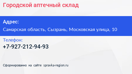 Городской аптечный склад по адресу Самарская область, Сызрань, Московская улица, 10 в дальнейшем Организация, размещена в следующих категориях: