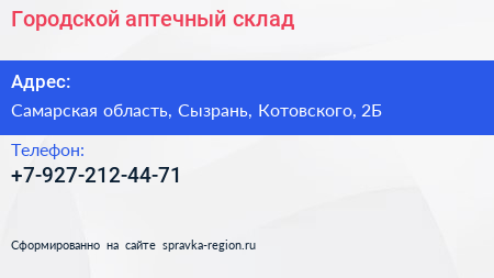 Городской аптечный склад по адресу Самарская область, Сызрань, Котовского, 2Б в дальнейшем Организация, размещена в следующих категориях: