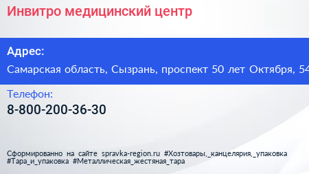 Инвитро, медицинский центр по адресу Самарская область, Сызрань, проспект 50 лет Октября, 54 в дальнейшем Организация, размещена в следующих категориях: