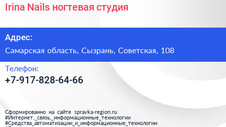 Irina Nails, ногтевая студия по адресу Самарская область, Сызрань, Советская, 108 в дальнейшем Организация, размещена в следующих категориях:
