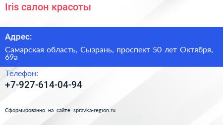 Iris, салон красоты по адресу Самарская область, Сызрань, проспект 50 лет Октября, 69а в дальнейшем Организация, размещена в следующих категориях: