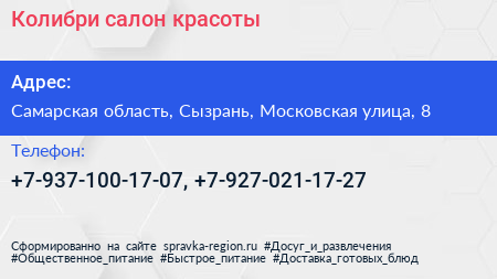 Колибри, салон красоты по адресу Самарская область, Сызрань, Московская улица, 8 в дальнейшем Организация, размещена в следующих категориях: