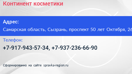 Континент косметики по адресу Самарская область, Сызрань, проспект 50 лет Октября, 26 в дальнейшем Организация, размещена в следующих категориях: