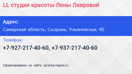 LL, студия красоты Лены Лавровой по адресу Самарская область, Сызрань, Ульяновская, 40 в дальнейшем Организация, размещена в следующих категориях: