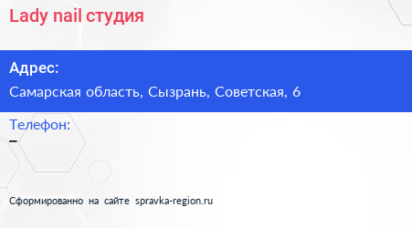 Lady nail, студия по адресу Самарская область, Сызрань, Советская, 6 в дальнейшем Организация, размещена в следующих категориях: