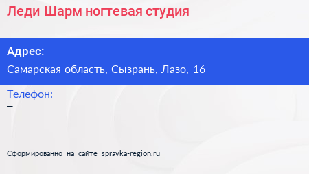 Леди Шарм, ногтевая студия по адресу Самарская область, Сызрань, Лазо, 16 в дальнейшем Организация, размещена в следующих категориях: