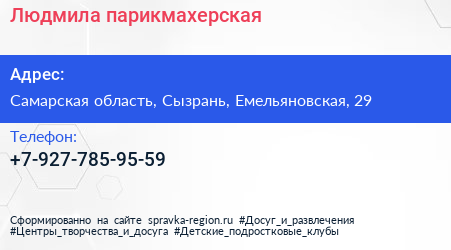 Людмила, парикмахерская по адресу Самарская область, Сызрань, Емельяновская, 29 в дальнейшем Организация, размещена в следующих категориях: