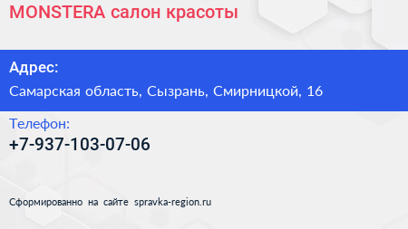 MONSTERA, салон красоты по адресу Самарская область, Сызрань, Смирницкой, 16 в дальнейшем Организация, размещена в следующих категориях: