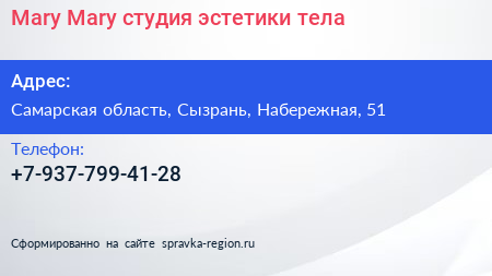 Mary&Mary, студия эстетики тела по адресу Самарская область, Сызрань, Набережная, 51 в дальнейшем Организация, размещена в следующих категориях: