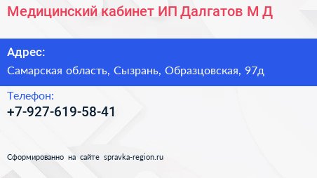 Медицинский кабинет, ИП Далгатов М.Д. по адресу Самарская область, Сызрань, Образцовская, 97д в дальнейшем Организация, размещена в следующих категориях: