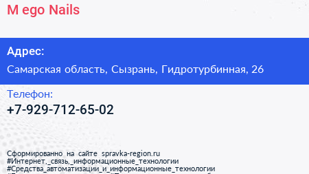 M.ego Nails по адресу Самарская область, Сызрань, Гидротурбинная, 26 в дальнейшем Организация, размещена в следующих категориях:
