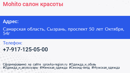 Mohito, салон красоты по адресу Самарская область, Сызрань, проспект 50 лет Октября, 54г в дальнейшем Организация, размещена в следующих категориях: