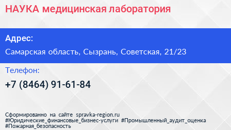 НАУКА, медицинская лаборатория по адресу Самарская область, Сызрань, Советская, 21/23 в дальнейшем Организация, размещена в следующих категориях: