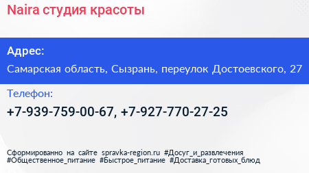 Naira, студия красоты по адресу Самарская область, Сызрань, переулок Достоевского, 27 в дальнейшем Организация, размещена в следующих категориях: