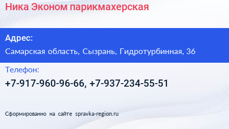 Ника Эконом, парикмахерская по адресу Самарская область, Сызрань, Гидротурбинная, 36 в дальнейшем Организация, размещена в следующих категориях: