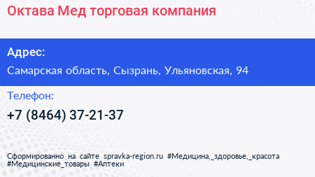 Октава-Мед, торговая компания по адресу Самарская область, Сызрань, Ульяновская, 94 в дальнейшем Организация, размещена в следующих категориях: