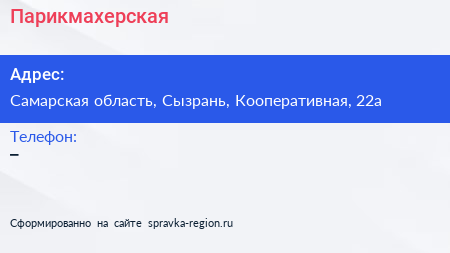 Парикмахерская по адресу Самарская область, Сызрань, Кооперативная, 22а в дальнейшем Организация, размещена в следующих категориях: