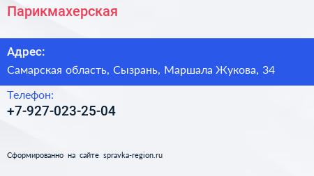 Парикмахерская по адресу Самарская область, Сызрань, Маршала Жукова, 34 в дальнейшем Организация, размещена в следующих категориях:
