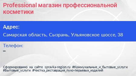 Professional, магазин профессиональной косметики по адресу Самарская область, Сызрань, Ульяновское шоссе, 38 в дальнейшем Организация, размещена в следующих категориях: