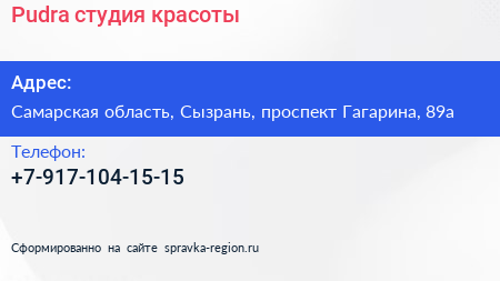 Pudra, студия красоты по адресу Самарская область, Сызрань, проспект Гагарина, 89а в дальнейшем Организация, размещена в следующих категориях: