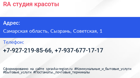 RA, студия красоты по адресу Самарская область, Сызрань, Советская, 1 в дальнейшем Организация, размещена в следующих категориях: