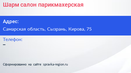 Шарм, салон-парикмахерская по адресу Самарская область, Сызрань, Кирова, 75 в дальнейшем Организация, размещена в следующих категориях: