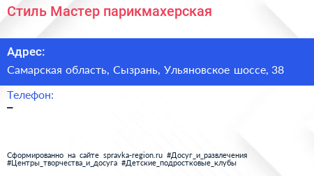 Стиль Мастер, парикмахерская по адресу Самарская область, Сызрань, Ульяновское шоссе, 38 в дальнейшем Организация, размещена в следующих категориях: