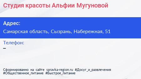Студия красоты Альфии Мугуновой по адресу Самарская область, Сызрань, Набережная, 51 в дальнейшем Организация, размещена в следующих категориях: