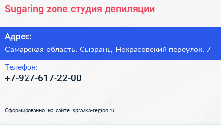 Sugaring zone, студия депиляции по адресу Самарская область, Сызрань, Некрасовский переулок, 7 в дальнейшем Организация, размещена в следующих категориях: