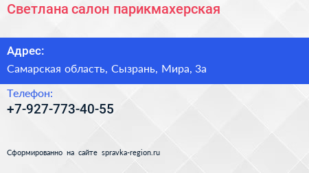 Светлана, салон-парикмахерская по адресу Самарская область, Сызрань, Мира, 3а в дальнейшем Организация, размещена в следующих категориях: