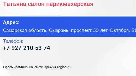 Татьяна, салон-парикмахерская по адресу Самарская область, Сызрань, проспект 50 лет Октября, 51 в дальнейшем Организация, размещена в следующих категориях: