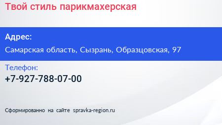 Твой стиль, парикмахерская по адресу Самарская область, Сызрань, Образцовская, 97 в дальнейшем Организация, размещена в следующих категориях: