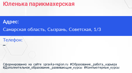Юленька, парикмахерская по адресу Самарская область, Сызрань, Советская, 1/3 в дальнейшем Организация, размещена в следующих категориях: