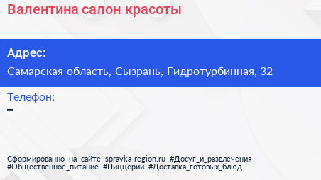 Валентина, салон красоты по адресу Самарская область, Сызрань, Гидротурбинная, 32 в дальнейшем Организация, размещена в следующих категориях: