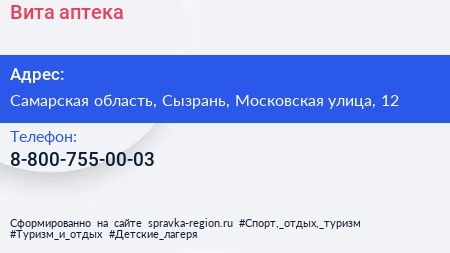 Вита, аптека по адресу Самарская область, Сызрань, Московская улица, 12 в дальнейшем Организация, размещена в следующих категориях: