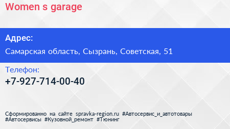 Women`s garage по адресу Самарская область, Сызрань, Советская, 51 в дальнейшем Организация, размещена в следующих категориях: