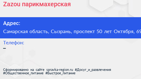 Zazou, парикмахерская по адресу Самарская область, Сызрань, проспект 50 лет Октября, 69 в дальнейшем Организация, размещена в следующих категориях: