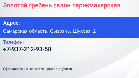 Золотой гребень, салон-парикмахерская по адресу Самарская область, Сызрань, Шухова, 2 в дальнейшем Организация, размещена в следующих категориях: