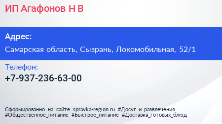 ИП Агафонов Н.В. по адресу Самарская область, Сызрань, Локомобильная, 52/1 в дальнейшем Организация, размещена в следующих категориях: