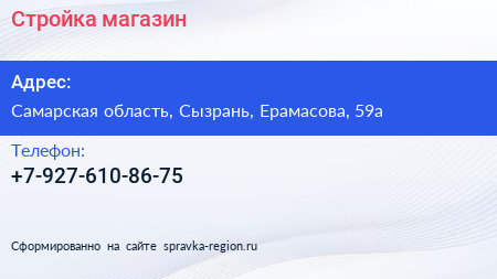 Стройка, магазин по адресу Самарская область, Сызрань, Ерамасова, 59а в дальнейшем Организация, размещена в следующих категориях: