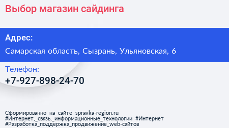 Выбор, магазин сайдинга по адресу Самарская область, Сызрань, Ульяновская, 6 в дальнейшем Организация, размещена в следующих категориях: