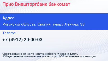 Прио-Внешторгбанк, банкомат по адресу Рязанская область, Скопин, улица Ленина, 33 в дальнейшем Организация, размещена в следующих категориях: