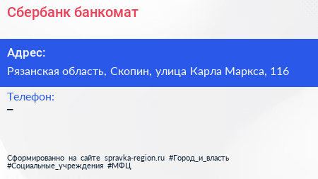 Сбербанк, банкомат по адресу Рязанская область, Скопин, улица Карла Маркса, 116 в дальнейшем Организация, размещена в следующих категориях: