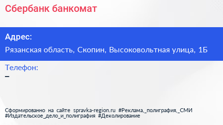 Сбербанк, банкомат по адресу Рязанская область, Скопин, Высоковольтная улица, 1Б в дальнейшем Организация, размещена в следующих категориях: