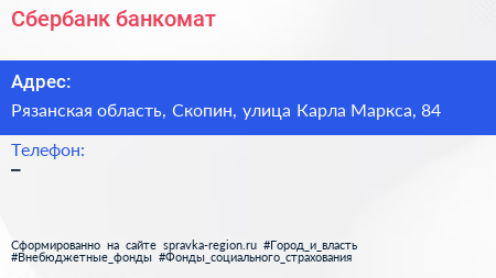 Сбербанк, банкомат по адресу Рязанская область, Скопин, улица Карла Маркса, 84 в дальнейшем Организация, размещена в следующих категориях: