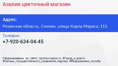 Азалия, цветочный магазин по адресу Рязанская область, Скопин, улица Карла Маркса, 111 в дальнейшем Организация, размещена в следующих категориях: