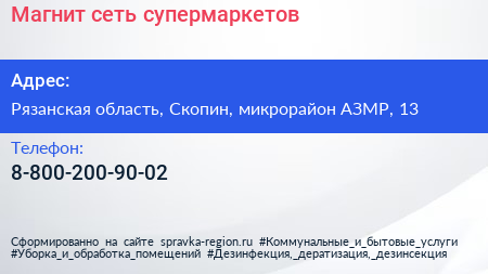 Магнит, сеть супермаркетов по адресу Рязанская область, Скопин, микрорайон АЗМР, 13 в дальнейшем Организация, размещена в следующих категориях: