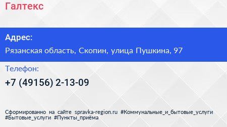 Галтекс по адресу Рязанская область, Скопин, улица Пушкина, 97 в дальнейшем Организация, размещена в следующих категориях: